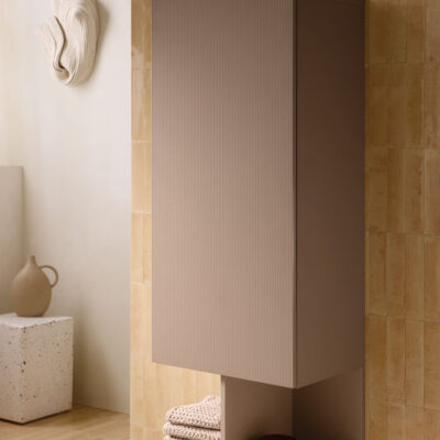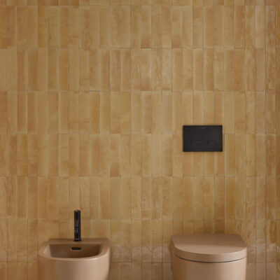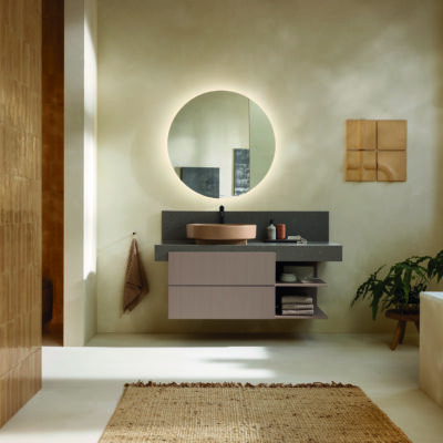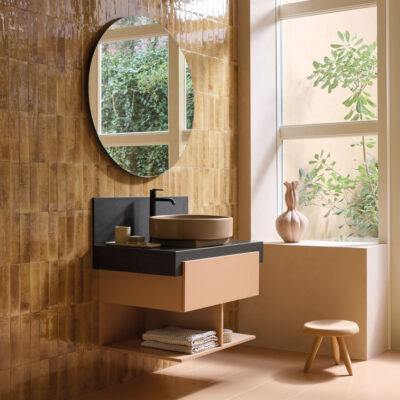 “We hebben drie verschillende kleuren geselecteerd en een reeks vormen die eindeloze personalisatie mogelijk maken”, vervolgt ze. “Het idee was om het traditionele canvas van witte keramiek te veranderen in een huidkleurige, aardse tint, zodat de sanitaire objecten meer diepgang krijgen. De nieuwe terracottakleur ‘clay terra’ vormt de centrale kleur van de serie. Het kleurenpalet van de meubels varieert van wit tot warme bruintinten en antraciet.”