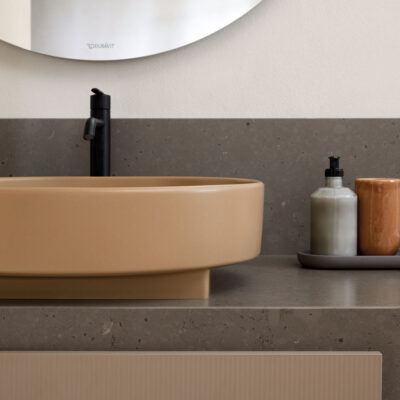 Met haar Duravit Balcoon-serie benadrukt Patricia Urquiola dat ook het middensegment bijzonder stijlvol kan zijn. Zeker als je het combineert met de juiste kleuren: ‘Het idee was om het traditionele witte canvas te veranderen in een canvas met huidkleurige, aardse tinten.’