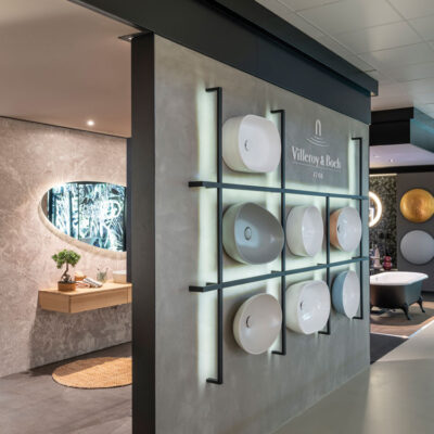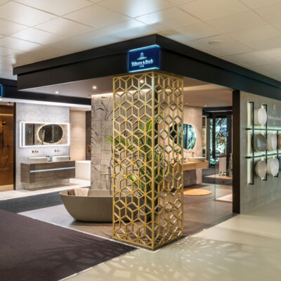 “En kijk je langs de trap naar boven, dan wordt je oog als door een magneet getrokken naar de ruime trendbox van Villeroy & Boch”, vult Han van Hardeveld, managing director bij Villeroy & Boch Group Nederland, aan. De heren, ze kennen elkaar al meer dan dertig jaar, staan naast elkaar, bij de eerste treden van de trap, en kijken tevreden naar boven.