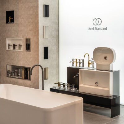 Uiteraard heeft Ideal Standard een mooie eigen plek in de showroom van Van Heugten. Schuin tegenover de trendbox van Villeroy & Boch, met fraaie doorkijkjes, aan de andere kant van de trap. Daar is over nagedacht. Uiteraard.